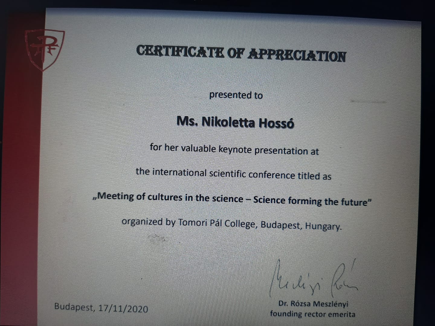 A Tomori Pál Főiskola és a Magyar Tudományos Akadémia közös rendezésű online nemzetközi konferenciájának nyitó plenáris előadását Hossó Nikoletta c. egyetemi docens, az NPRSZ alapító elnöke tartotta angol nyelven.