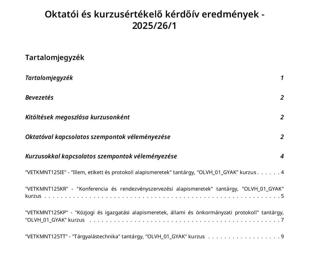 Célja: Az oktatói munka és a tantárgyak színvonalának hallgatói visszajelzéseken alapuló értékelése.